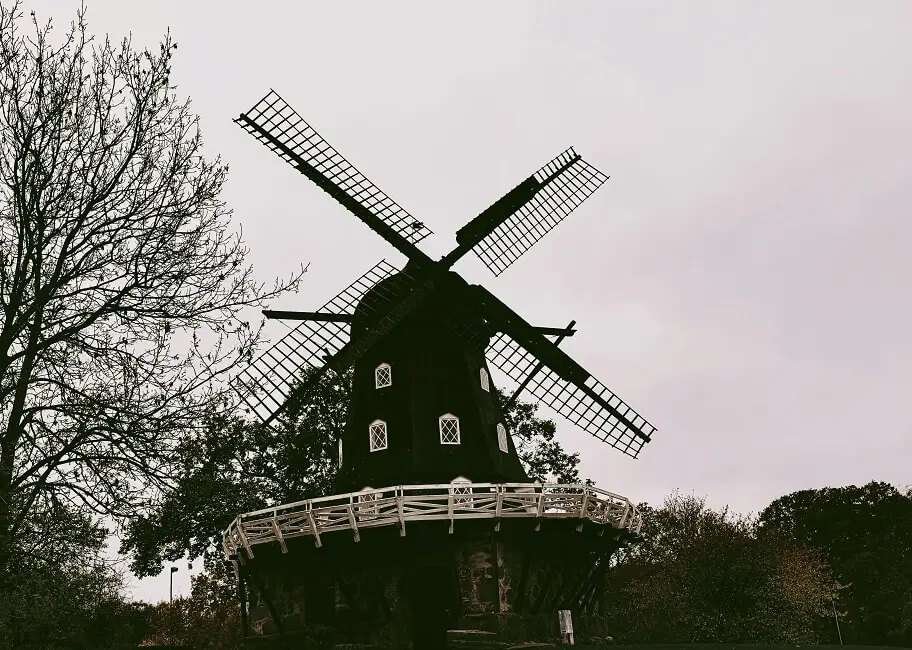 The De Gooyer Windmill in Amsterdam is a tall and famous building. It stands about 90 feet tall. If you think about one-third of that height, it would be around 30 feet — a big part of the windmill.